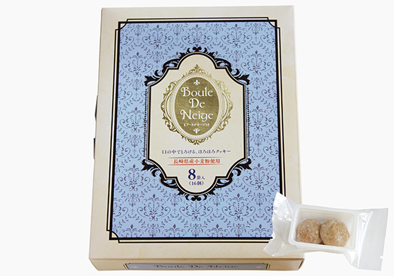 【特徴】⾧崎とゆかりの深いスペインで生まれた伝統的な焼き菓子「ポルボロン」は、“幸せを呼ぶお菓子”として親しまれています。この「ポルボロン」がフランスに伝わり、誕生したのが「ブールドネージュ」。フランス語で「雪の玉」を意味し、雪のような口溶けと白い見た目に由来すると言われ、お祝いの席などで愛されてきた、幸せを象徴する伝統菓子です。⾧崎県産の小麦粉に北海道産バター、アーモンドプードル、国産はちみつを合わせた生地をじっくりと焼き上げ、仕上げには有機粉糖を二度重ねてトッピング。さくさく、ほろほろとした食感と、口溶けのよいやさしい甘さのクッキーに仕上げました。