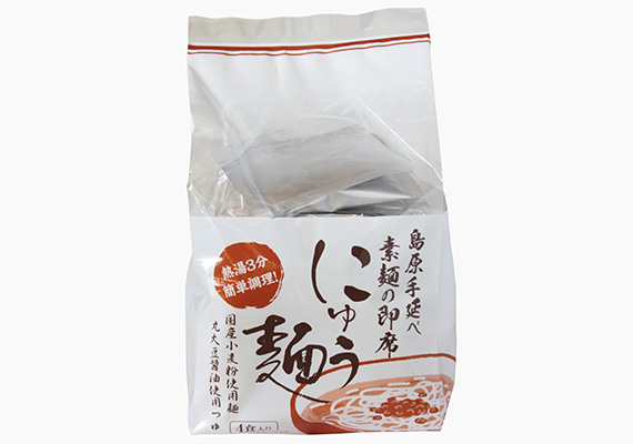 【特徴】九州産小麦を100%使用した「島原手延べそうめん」を茹でて乾燥させた即席めんです。手延べならではのコシの強さと旨味はそのままに、熱湯をかけて3分で手軽にお召し上がりいただけます。つゆ、乾燥ねぎ付きで4食入り。回転備蓄にもどうぞ。